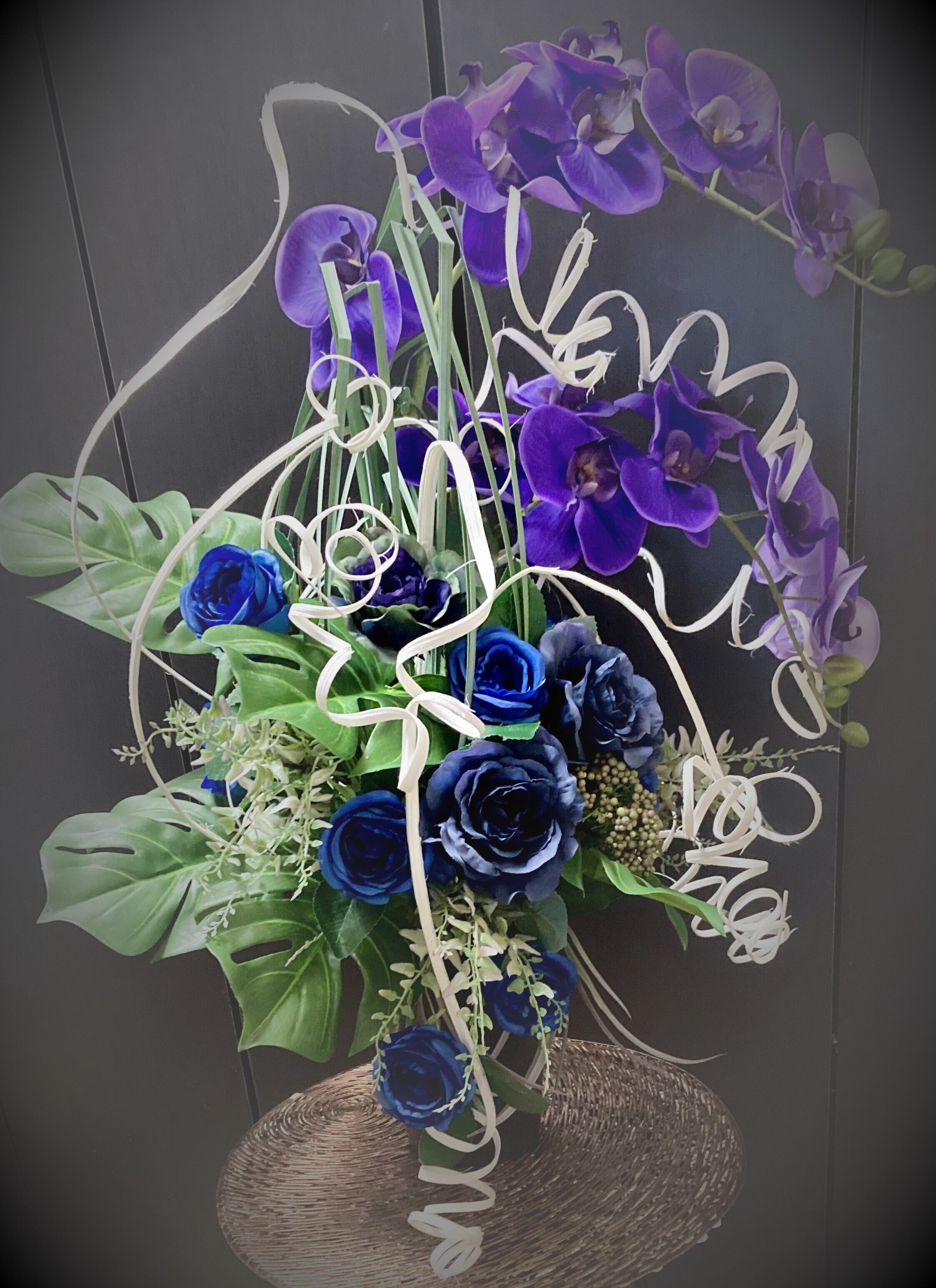 アーティフィシャルフラワー。紫の胡蝶蘭と青のバラのアレンジメントです。